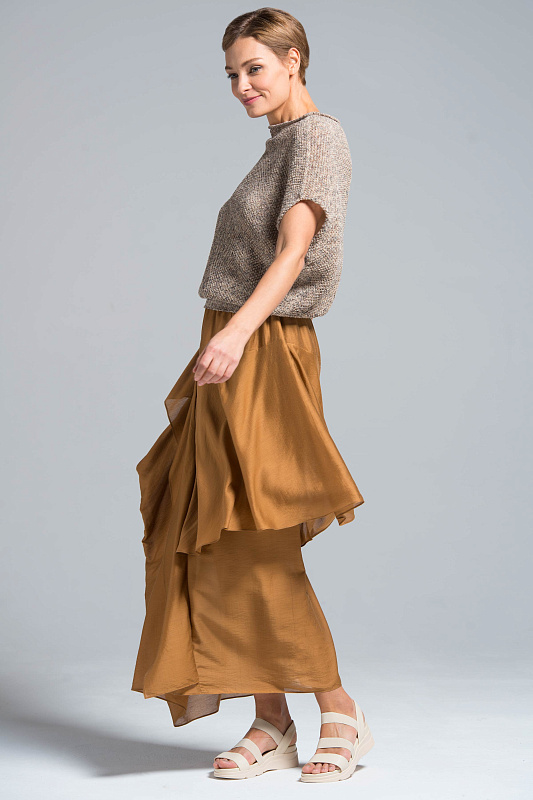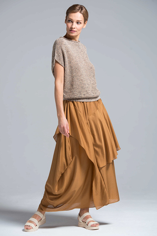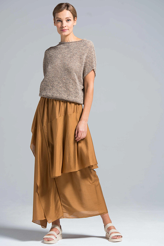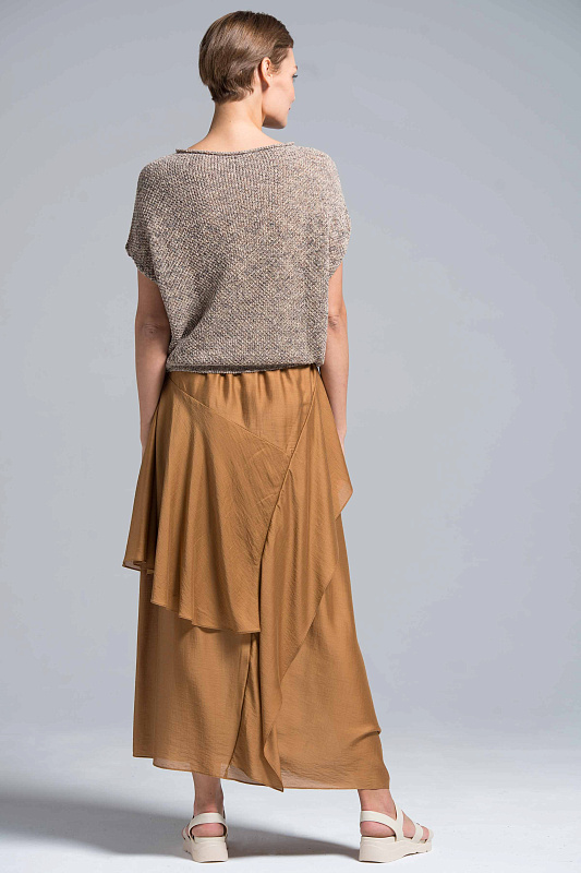 Юбка "Япония" сложной авторской конструкции. Пояс юбки на резинке, легкие воланы, выполненные по косой, делают эту модель очень женственной и придают ей романтический окрас, а многослойный силуэт и асимметрия позволяют создавать сложные и динамичные образы. Модель выполнена из нежной и воздушной французской вискозы.