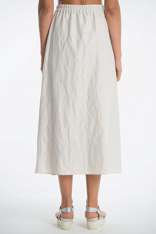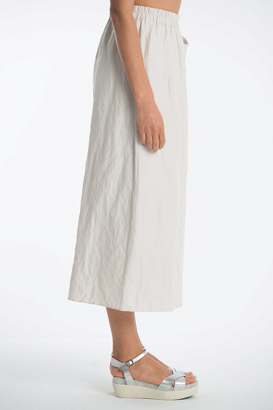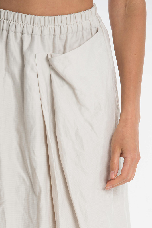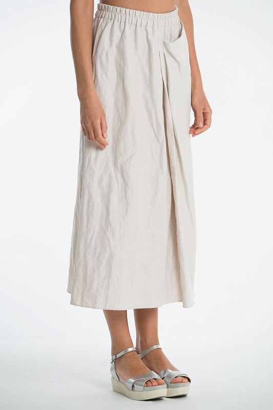 Прямая юбка миди. Спереди цельнокроенная драпирующаяся деталь, имитирующая запах. Пояс на резинке.