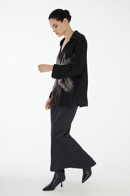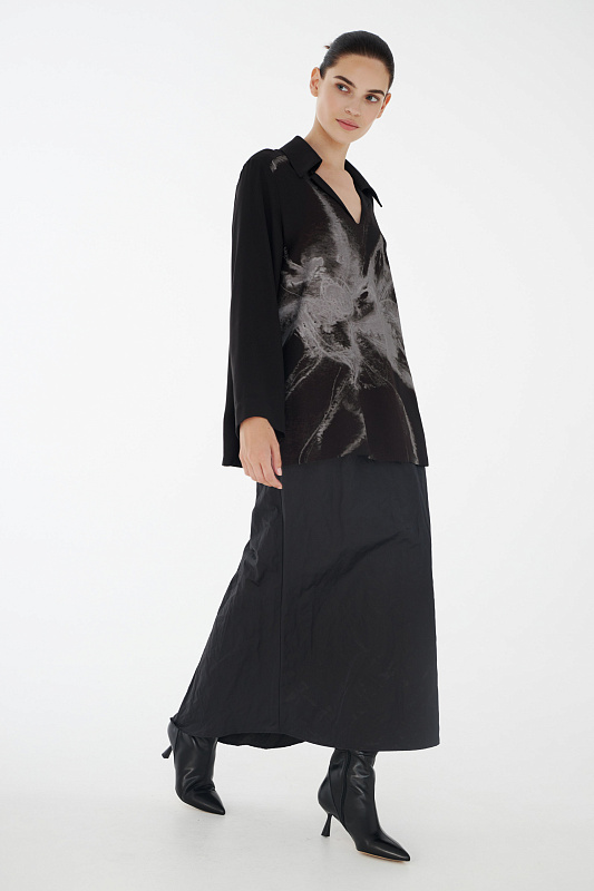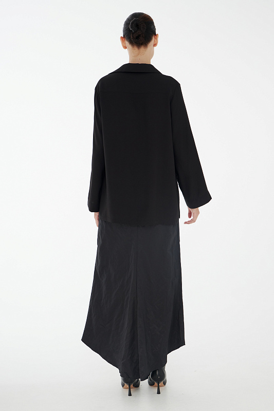 Юбка с хвостом, как плавное движение волн, придает образу загадочности и изысканности. Пояс на резинке и пуговице. А-силуэт - это четкие линии и аккуратность кроя. Потайная молния практически незаметна с лицевой стороны. Классическая длина и удлиненный хвост - символ статуса и деловой жизни. Жатый фактурный хлопок с деликатным блеском создает неповторимые узоры, будоража воображение той, кто надел эту модель.