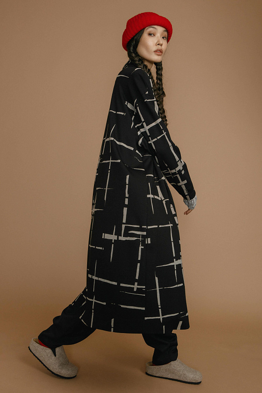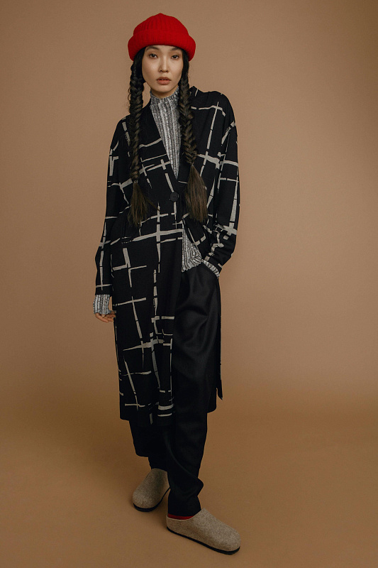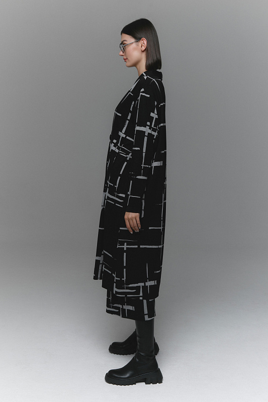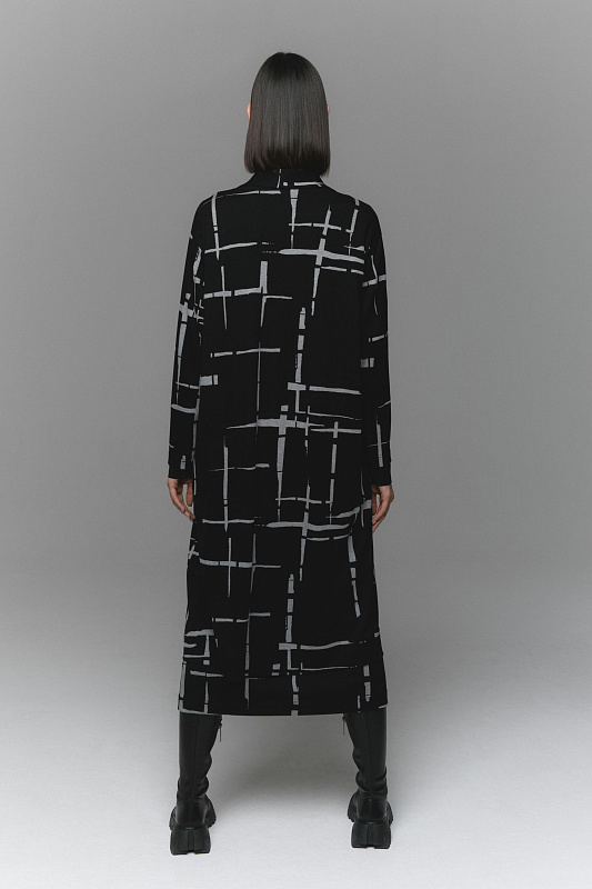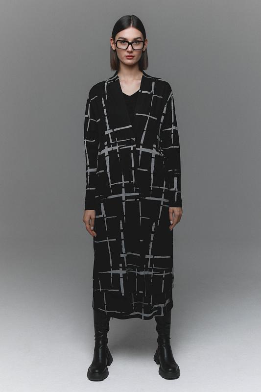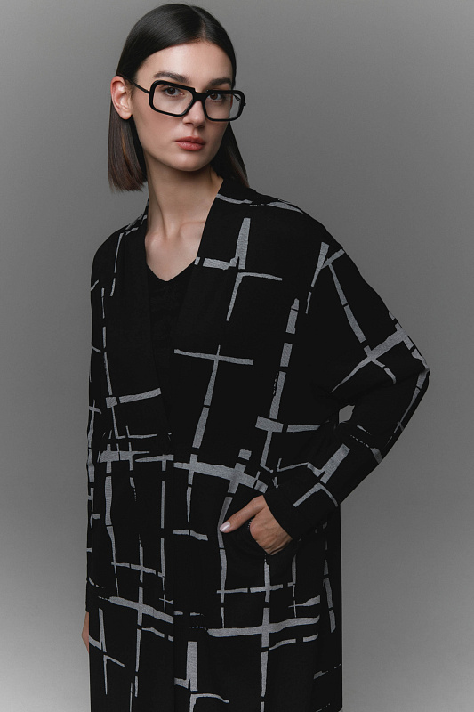 Удлиненный кардиган из джерси создан для тех, кто стремится выглядеть элегантно и современно, не жертвуя комфортом. Приспущенная линия плеч придает образу непринужденности, а изящества добавляет подчеркивающий красоту шеи V-образный воротник. Эффектный дизайнерский принт «штрихи» визуально стройнит. Для удобства в кардигане предусмотрены прорезные карманы. Застежка на большую оригинальную пуговицу.