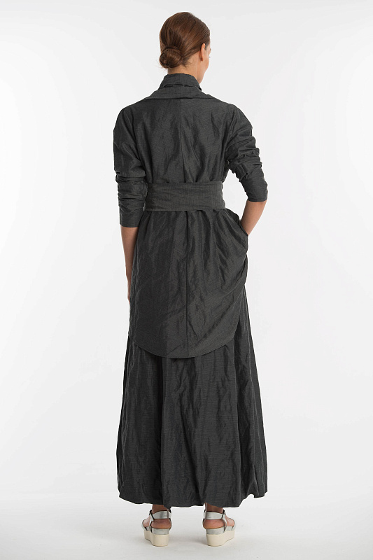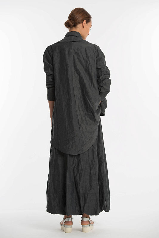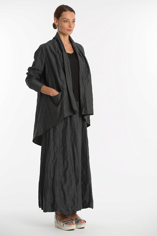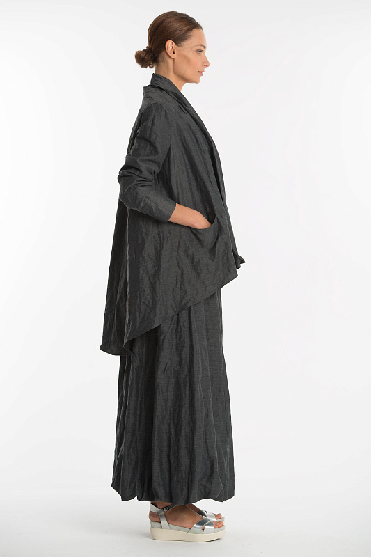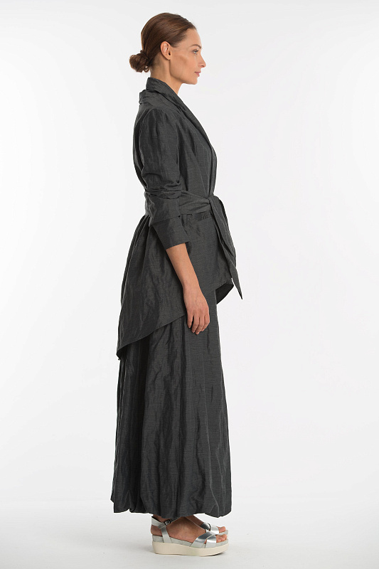 Лёгкий жакет накидка А-силуэта с прорезными карманами. Летящий авторский крой, удлинённая спинка. В комплекте с широким поясом, с помощью которого можно изменить силуэт., подчеркнуть талию. Жатая ткань с металлизированной нитью, запоминающая форму, с эффектом мемори.
