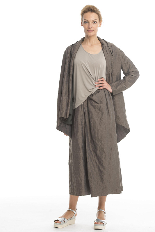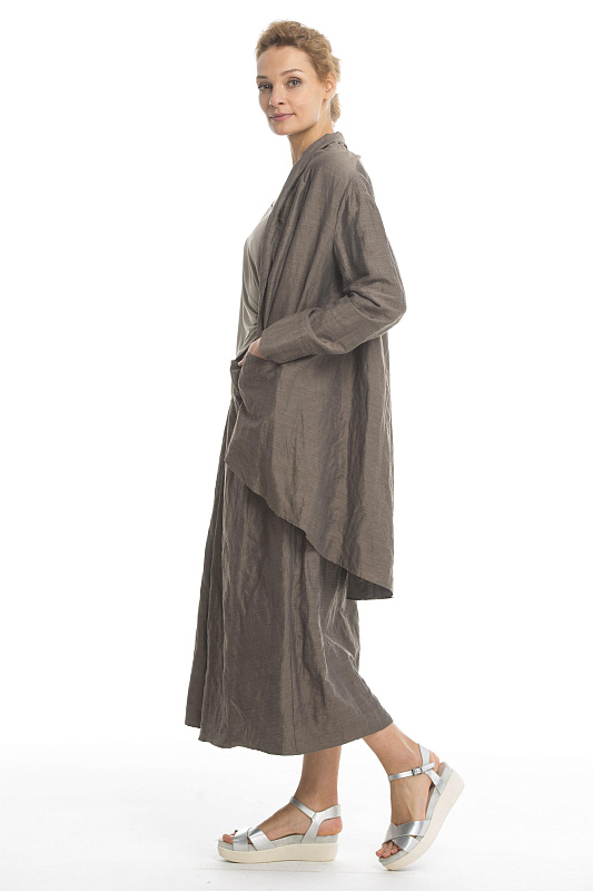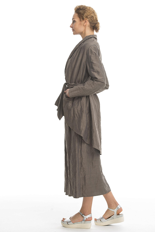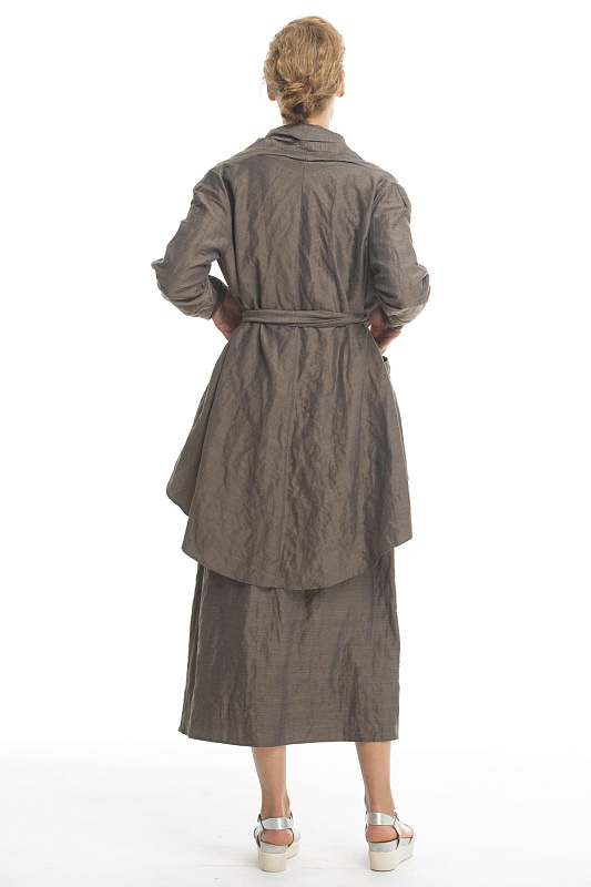Лёгкий жакет накидка А-силуэта с прорезными карманами. Летящий авторский крой, удлинённая спинка. В комплекте с широким поясом, с помощью которого можно изменить силуэт., подчеркнуть талию. Жатая ткань с металлизированной нитью, запоминающая форму, с эффектом мемори.