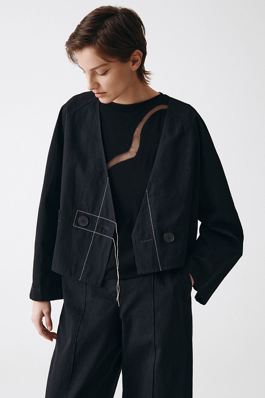 Жакет — истинная дизайнерская работа, понимание которой возможно через разрушение стереотипов. Укороченная длина, рукав реглан и мягкий ворот без лацканов — не теряющий актуальности тренд. Застегните жакет на левую или на правую сторону, и вы получите два разных силуэта: одна полочка короткая, другая удлиненная с функциональным карманом. Еще один дизайнерский ход — спинка, составленная из двух частей разной длины. Строчка специально прервана и образует шлицу, раскрывающую неожиданные слои. Жакет ломает не только правила кроя, но и отделки. Контрастная белая строчка по черному плотному хлопку. Самая бунтарская деталь — намеренно оставленные свисающие концы белых нитей на строчке. Нитки живут, двигаются и подчеркивают рукотворность и смелость модели.