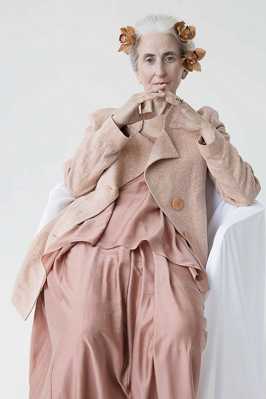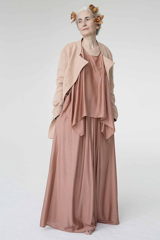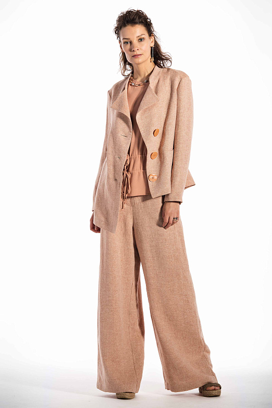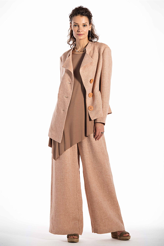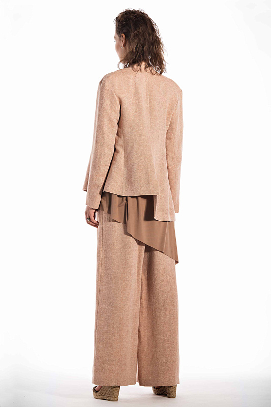 Легкий жакет, сложной асимметричной конструкции, на частичной подкладке. Прорезные карманы-щели, воротник-стойка и лацканы, удлиненный правый борт жакета создают неповторимый и запоминающийся образ. Ткань твидового переплетения с рисунком в елочку. Состав ткани оригинален - шелк-сырец и лен. Длина изделия по спинке: правая половинка - 60 см, левая половинка - 68 см.