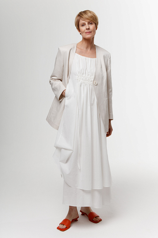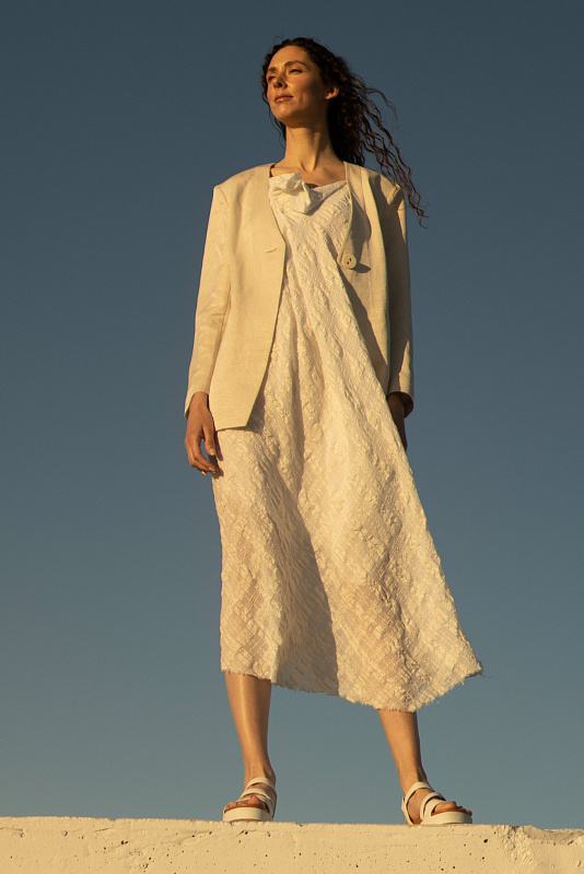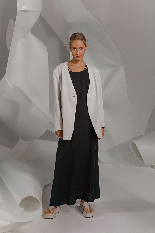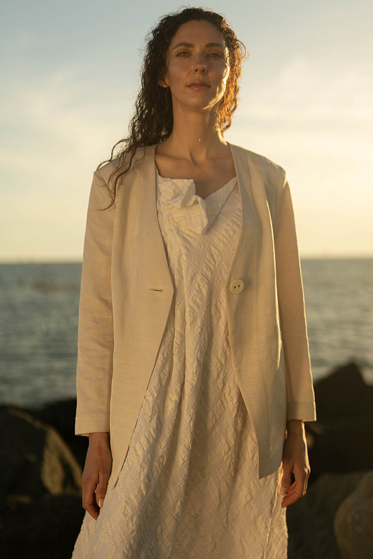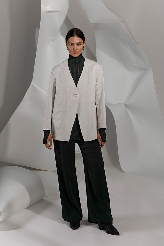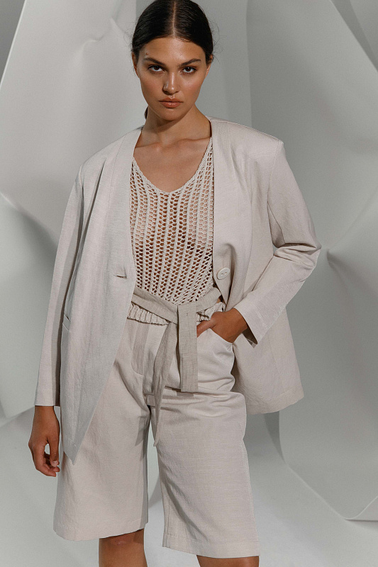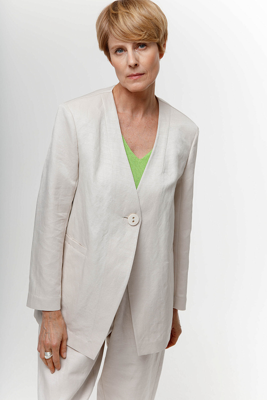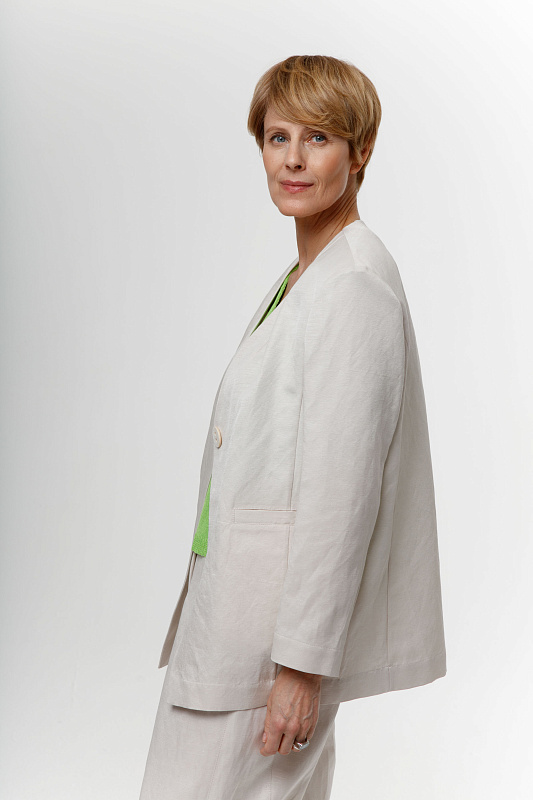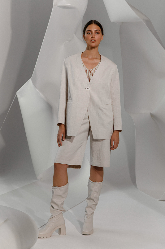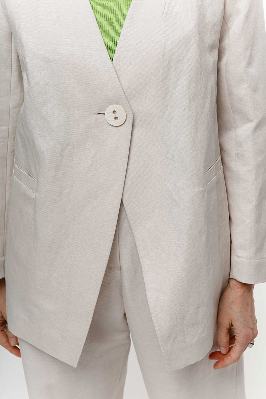 Эффектный одноборный жакет без лацканов прямого силуэта. Мягкая линия плеча. Втачной рукав. Карманы с листочкой. Жакет без подкладки. Модель выполнена из хлопковой ткани с добавлением льна с легким жемчужным блеском. Советуем сочетать этот жакет с брюками или шортами из такой же ткани и контрастным топом.