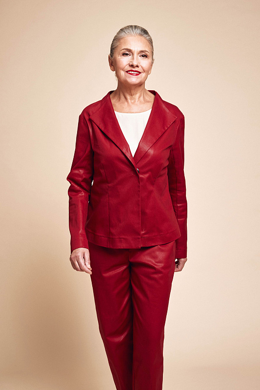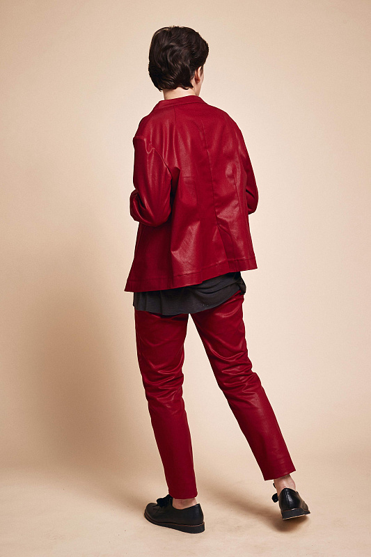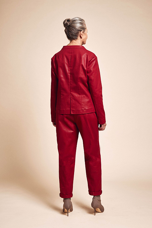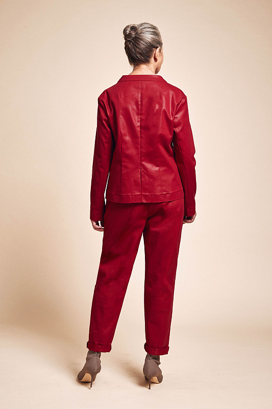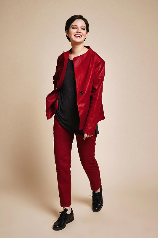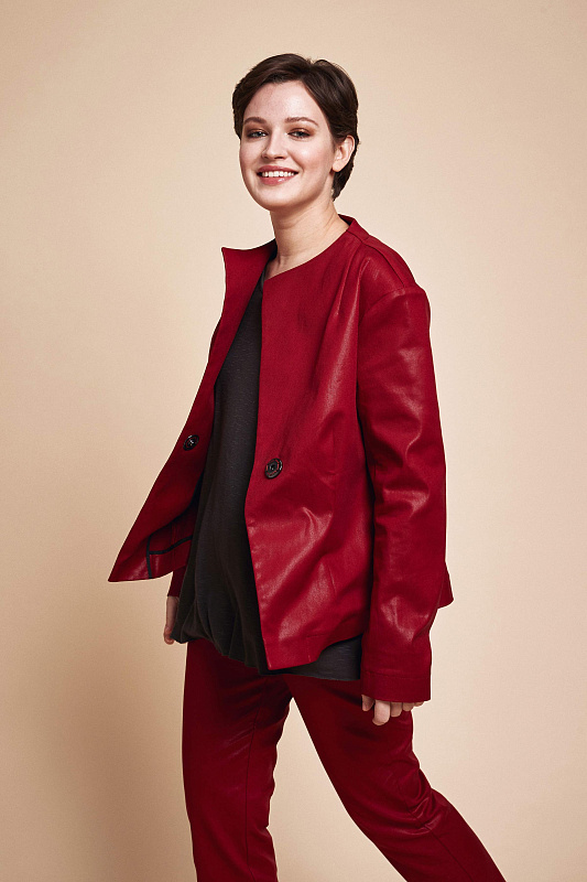 Жакет на кнопке с отложными лацканами, с вытачками и разрезом в среднем шве спинки. Приталенный силуэт в стиле куртки-косухи. Ткань – плотный хлопок с небольшим содержанием эластана.