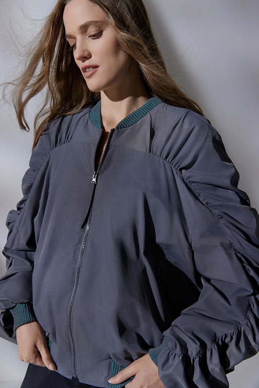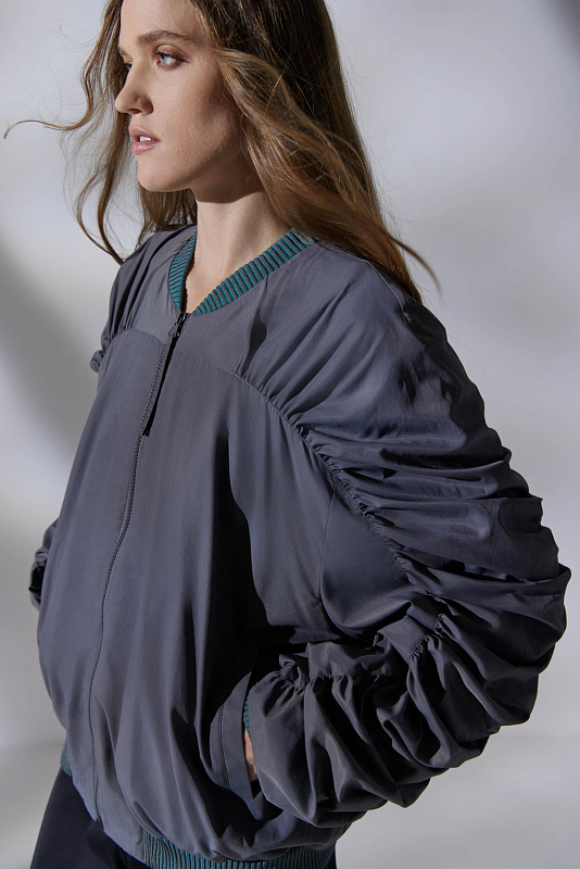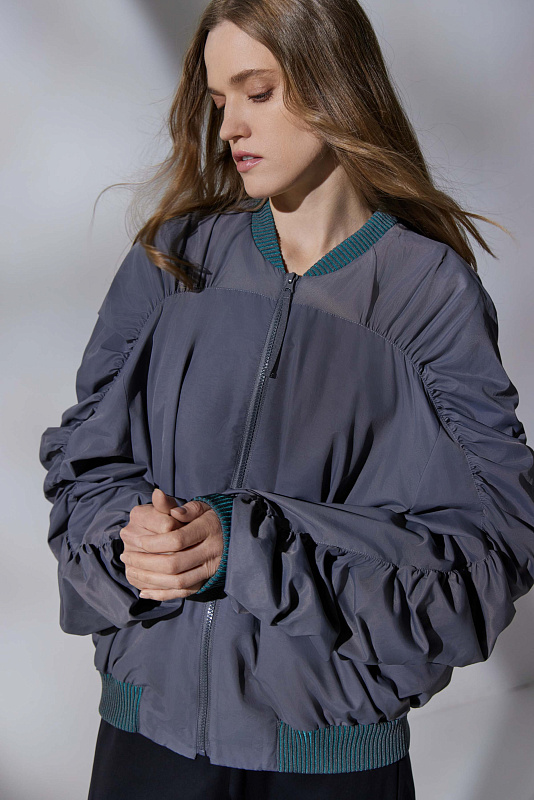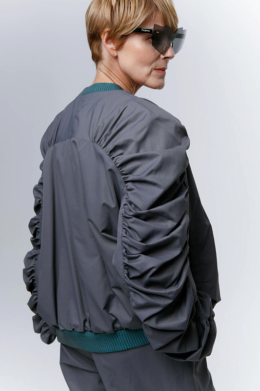 Креативный жакет-бомбер оригинальной дизайнерской конструкции. Эффектная сборка по спинке и кокетке по переду, переходящая в рукава. Застежка - тракторная молния. Трикотажные воротничок и манжеты выполнены из вискозной пряжи. Два удобных кармана. Жакет на шелковистой подкладке.