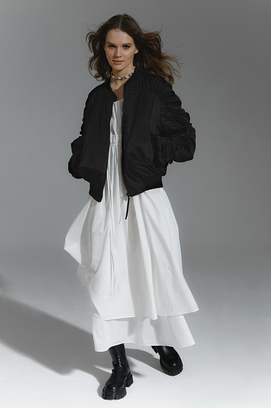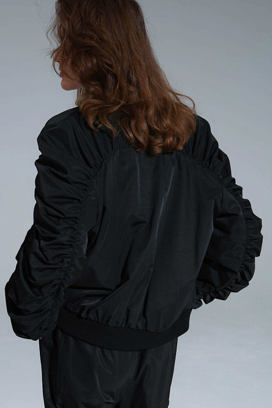 Креативный жакет-бомбер оригинальной дизайнерской конструкции. Эффектная сборка по спинке и кокетке по переду, переходящая в рукава. Застежка - тракторная молния. Трикотажные воротничок и манжеты выполнены из вискозной пряжи. Два удобных кармана. Жакет на шелковистой подкладке.
