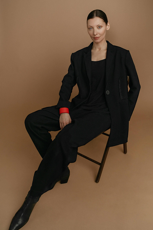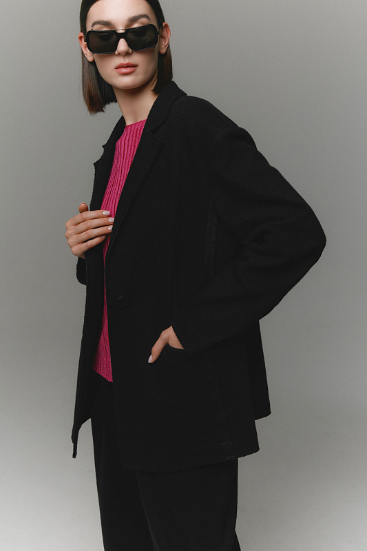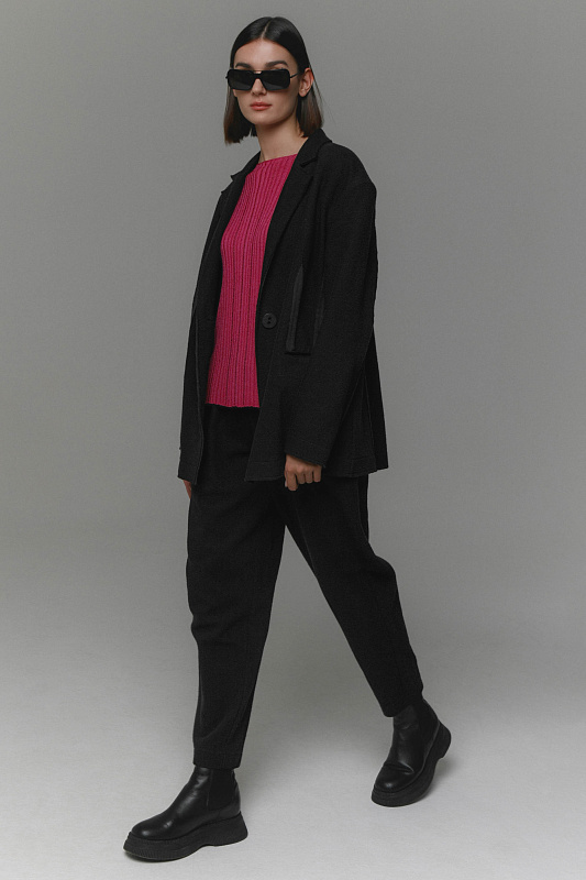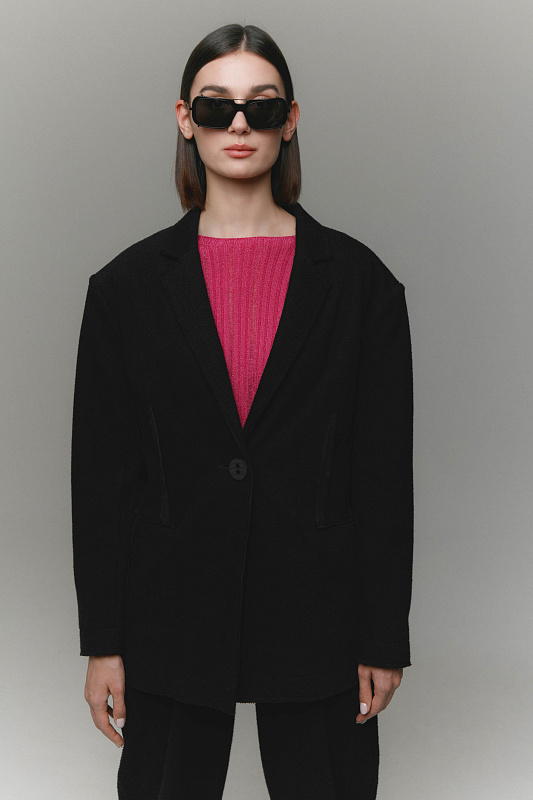 Однобортный полуприталенный жакет из мягкого и "уютного" джерси словно "махровой" фактуры. Жакет имеет лаконичный, почти классический крой, однако открытые швы и фактура ткани снимают градус формальности, и он не выглядит слишком "деловым", оставляя при этом возможность стилизовать его в не самом строгом офисном дресс-коде. Застежка - на большую пуговицу. Воротник, края рукавов и низ жакета не обработаны, что добавляет образу креатива. Прорезные карманы вместительны и незаметны, линия плеч приспущена, что гарантирует удобную посадку. Сочетаем жакет с брюками ромбами из одноименной капсулы для создания эффектного костюма.