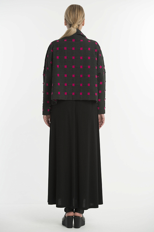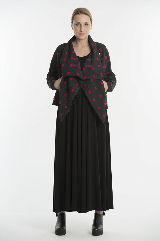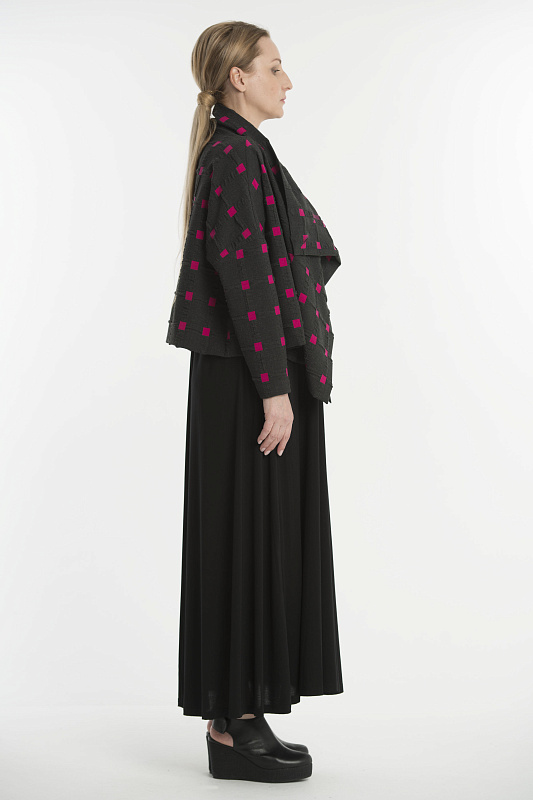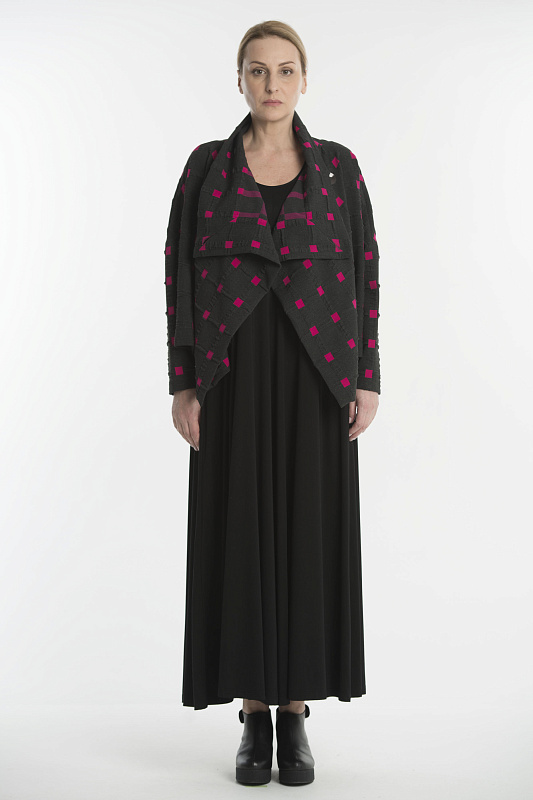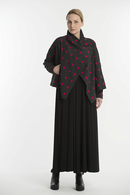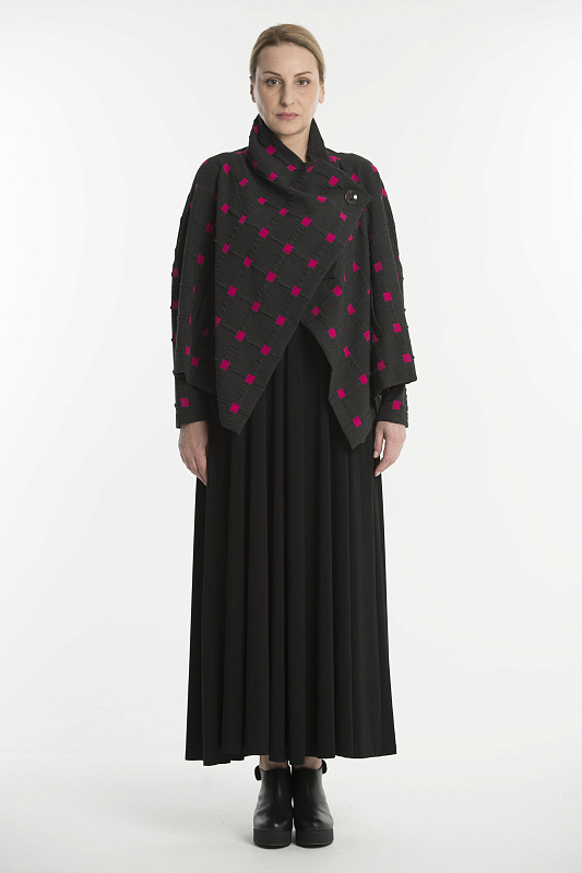 Ультрамодный мягкий жакет-кимоно с карманами. Полочки жакета свободно ниспадают фалдами и ассоциируются с японским костюмом. Геометрический рисунок перекликается с геометрическим кроем жакета.