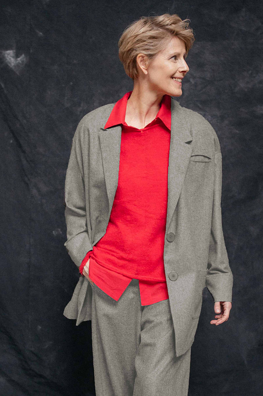 Жакет, изготовленный из премиальной шерсти, представляет собой стильный и элегантный элемент гардероба. Английский отложной воротник и нагрудный прорезной фальшь карман являются элементами классического костюма. Дизайнерская форма жакета – квадрат, без подкладки поддерживает оверсайз модели. Две шлицы сзади обеспечивают дополнительный комфорт. Современный вид и оригинальность придает застежка на одну пуговицу и два накладных кармана по бокам. Жакет является идеальной парой к брюкам арт. 8025112 и составляет с ними элегантный деловой или стильный casual-образ. Добавьте аксессуары и будьте уникальной на вечернем мероприятии.