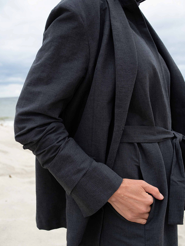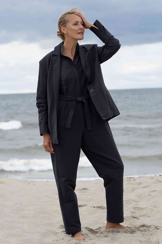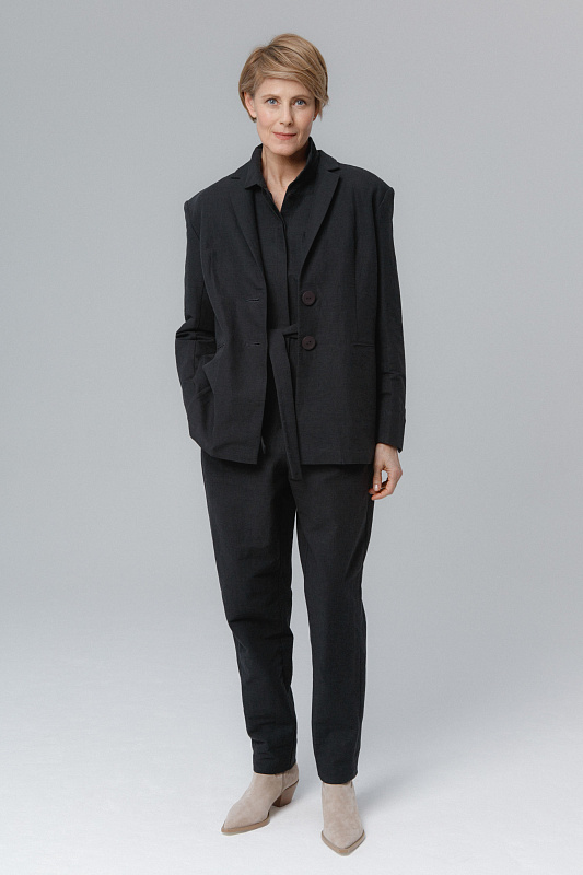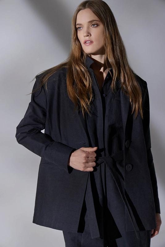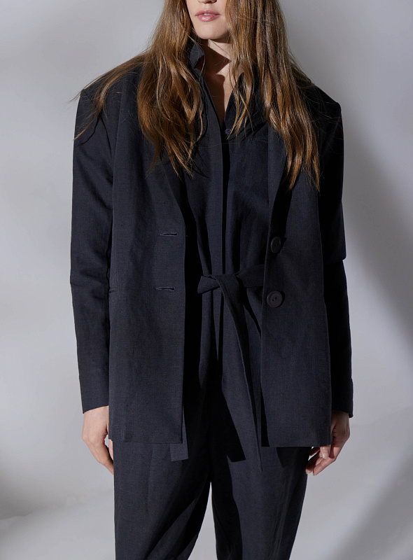 Прямой жакет с мягкой линией плеч — удачный вариант для формальных офисных образов, но при этом он легко встраивается и в повседневные аутфиты с джинсами. Для пошива лаконичной однобортной модели использован эластичный лен с добавлением хлопка, благодаря которым жакет будет хорошо держать форму и сохранять комфортный для тела микроклимат. Жакет без подклада. Манжеты с деликатными разрезами.