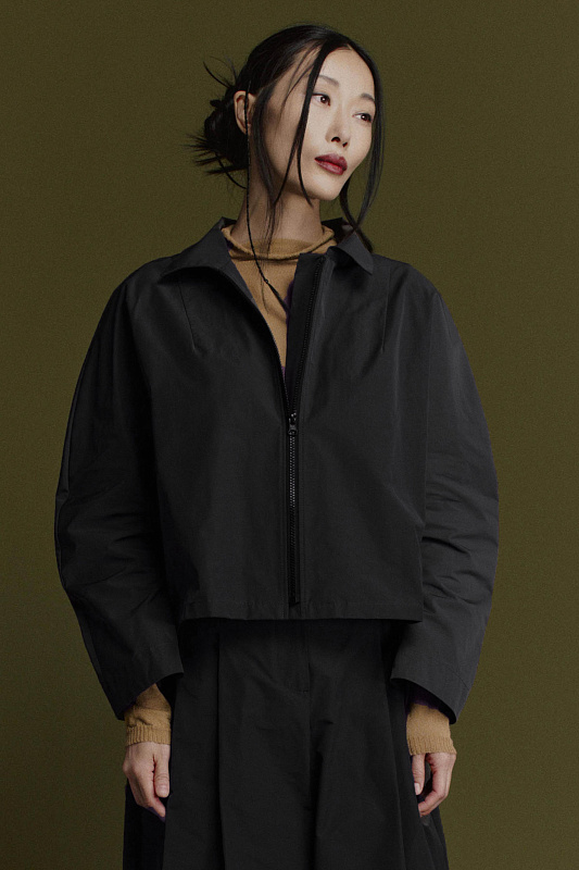Укороченный жакет прямого кроя с цельнокроеным рукавом — лаконично, но не скучно! Ластовица — не просто функциональный элемент, а продуманная дизайнерами изящная деталь. Мягкие вставки делают силуэт интереснее, а движения свободнее. Маленький воротник подчеркивает минимализм и ненавязчивую строгость. Разъемная молния позволяет носить жакет полностью застегнутым или расстегнуть для эффектного многослойного образа. Дополните жакет брюками  того же цвета артикул 81260, из той же капсулы, и костюм станет вашим любимчиком на каждый день.