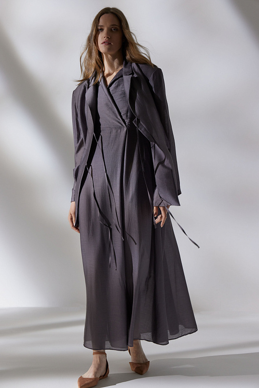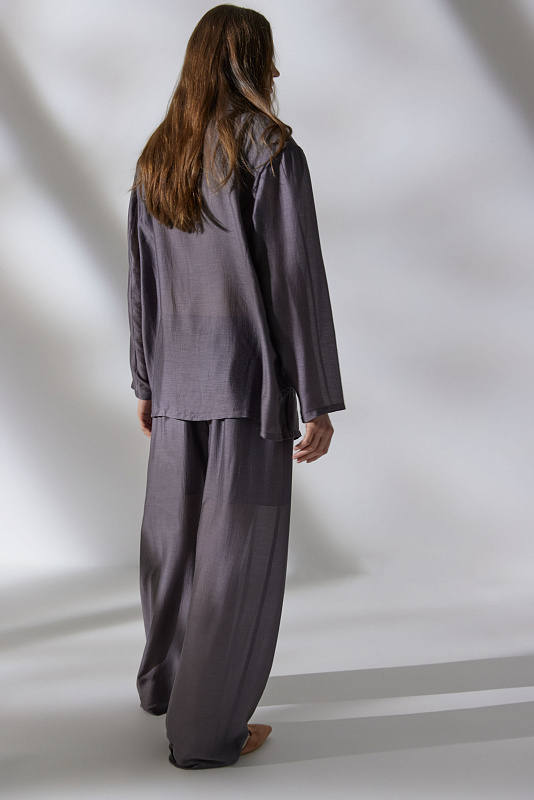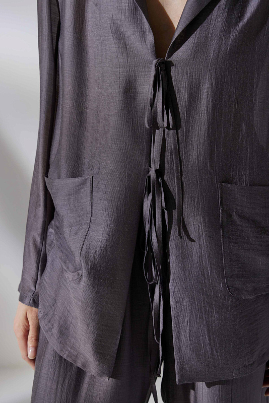 Вальяжный жакет выполнен из микромодала с добавлением шелка. Мягкая линия плеча. Завязка на тонкие декоративные шнурки. Два накладных кармана добавляют модели расслабленности. Стилизуем жакет с брюками из одноименной коллекции или в качестве легкой накидки на платье.