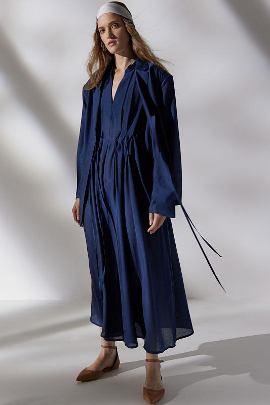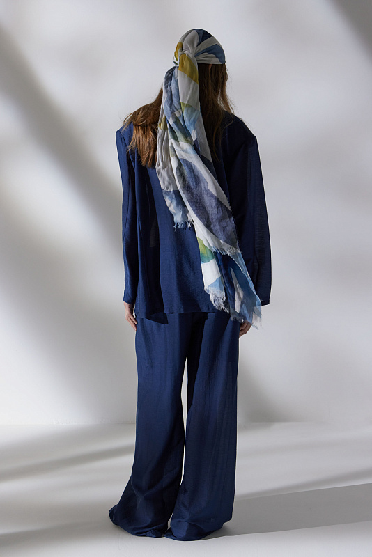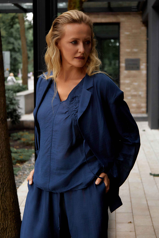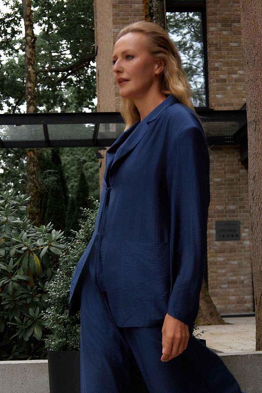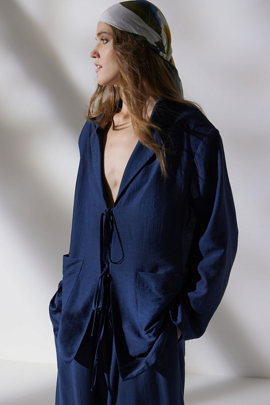 Вальяжный жакет выполнен из микромодала с добавлением шелка. Мягкая линия плеча. Завязка на тонкие декоративные шнурки. Два накладных кармана добавляют модели расслабленности. Стилизуем жакет с брюками из одноименной коллекции или в качестве легкой накидки на платье.