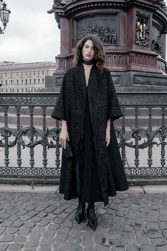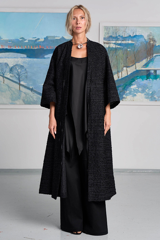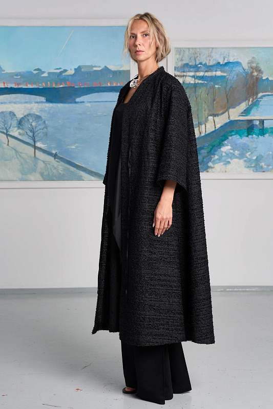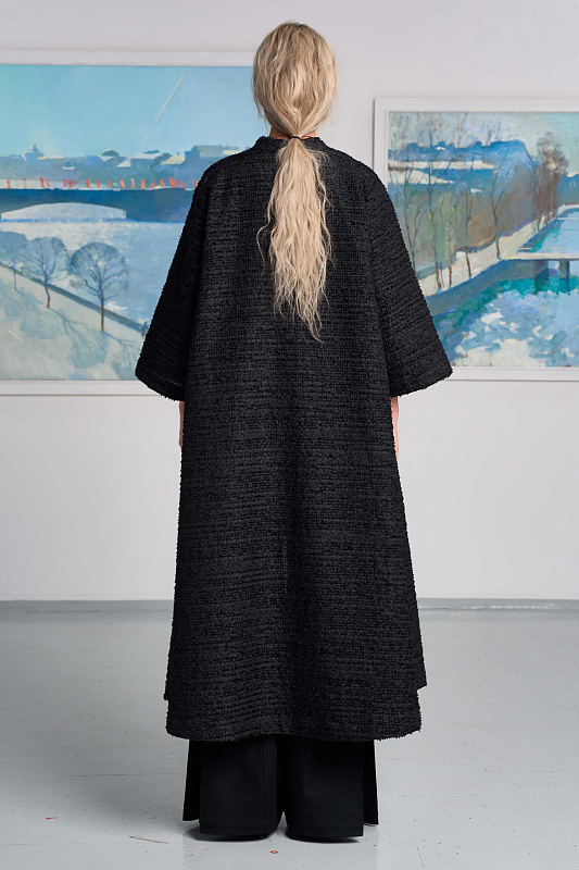 Элегантная накидка трапецевидного силуэта, как величавая мантия! Благодаря плотной ткани модель красиво расклешена и образует эффектную «колоколообразную» форму. Рукав реглан делает линию плеча плавной и узкой, а длина 3/4 пикантно открывает запястье. Модель без застежки. Для фиксации выше линии талии — тонкие завязки, которые не нарушают строгую концепцию. Главная особенность жакета — уникальная по текстуре ткань. Ее фактура тактильно и визуально напоминает вязанное полотно «букле», будто собранное из рельефных рядов. Но это только внешняя схожесть, материал представляет собой практичную смесь хлопка и современного материала.