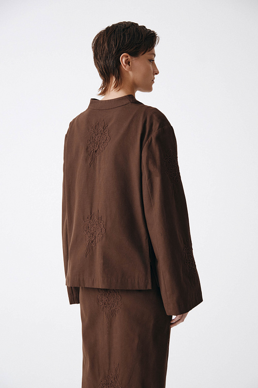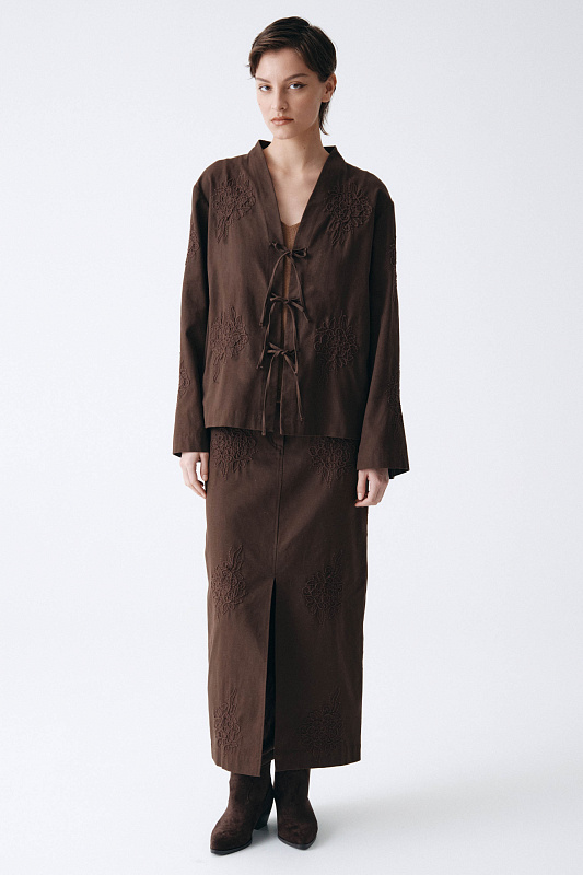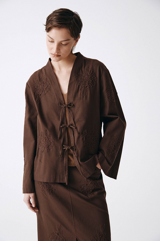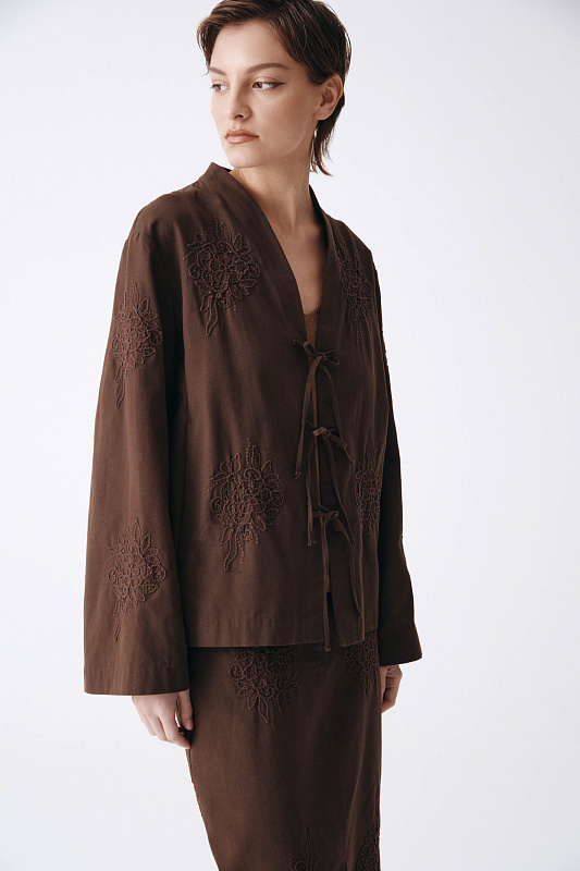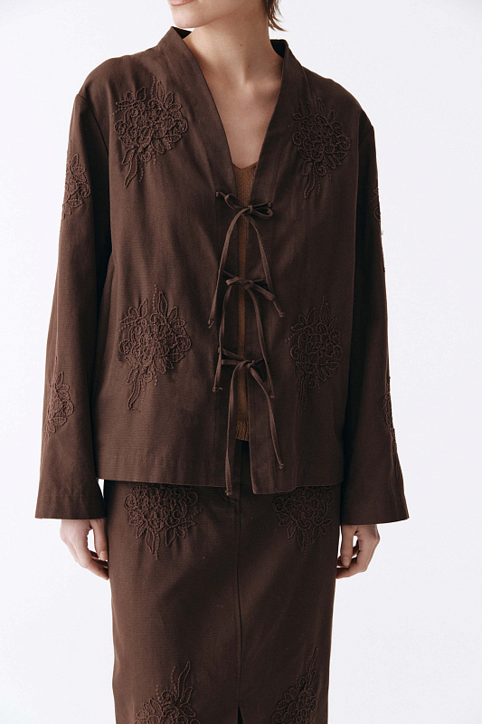 Название этого жакета от дизайнера — жакет-накидка, и это ключ к его пониманию. Это не просто верхняя одежда, а концепция. Воротник-шалька — утонченность и чистота линий. Никаких углов и лацканов — только мягкий изгиб, облегающий шею и грудь. Втачной рукав еле заметно расширен к низу, идеально скрывает запястье, оставляя интригу. Никаких пуговиц — только ваш собственный способ выразить настроение. Изящные завязки можно завязать как угодно: бант, узел или просто оставить свободно лежащими. Отсутствие жесткой застежки создает ощущение расширения к низу, что визуально сужает и смягчает верх. Ткань будто расшита вручную, украшена роскошной вышивкой. Обратите внимание на артикул 75264 и 25264 из этой капсулы. Выбирайте цвет и встречайте новый сезон вместе с ЛЕСЕЛЬ.