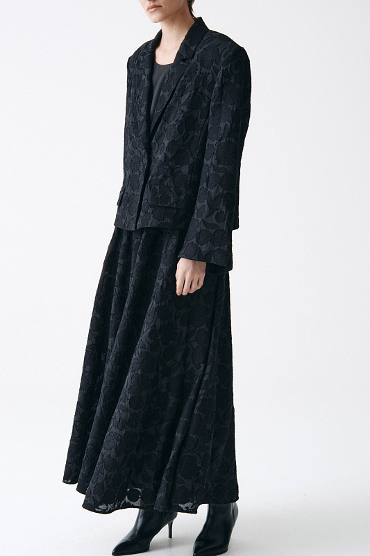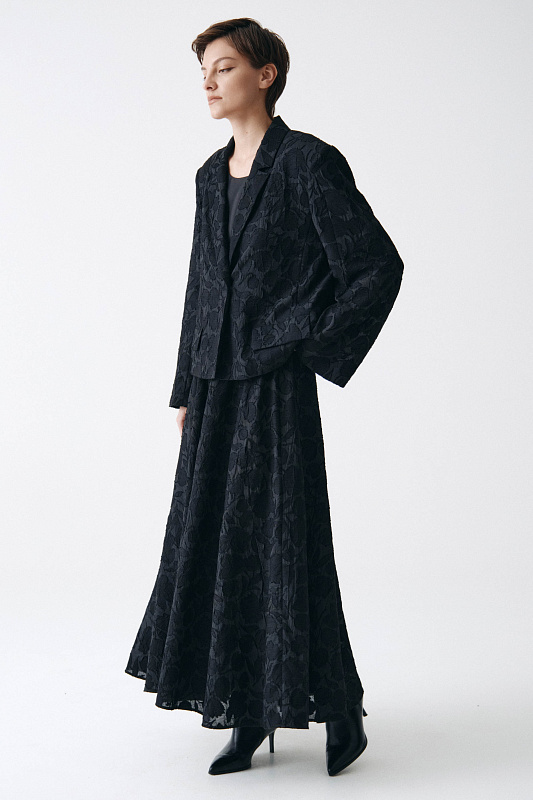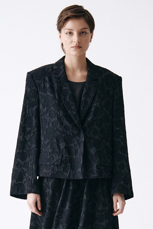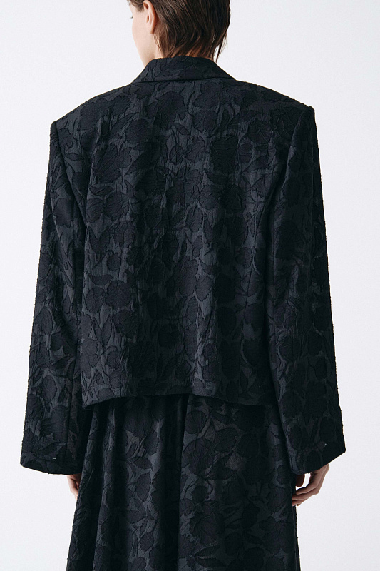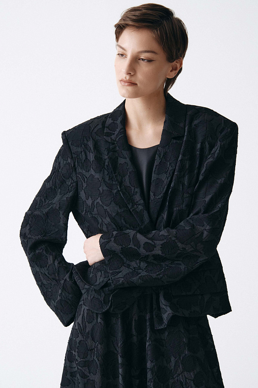 Классический однобортный укороченный жакет с потайной застежкой-кнопкой. Прямой рукав и прорезные неглубокие карманы с клапанами сохраняют классическую основу, контрастируя с укороченной длиной изделия. Такая длина оптически вытягивает силуэт, превращая классический элемент гардероба в современный. Увеличенная линия плеча подчеркивает безупречную геометрию силуэта, создавая идеальные пропорции. Плечи выглядят не «большими», а идеально прямыми и четкими. Отсутствие видимой застежки создает идеально линию и акцентирует внимание на качестве ткани. Настоящее произведение — это ткань, из которой выполнен жакет. На воздушном полупрозрачном полотне торжественно рассыпаны изысканные фактурные цветы.