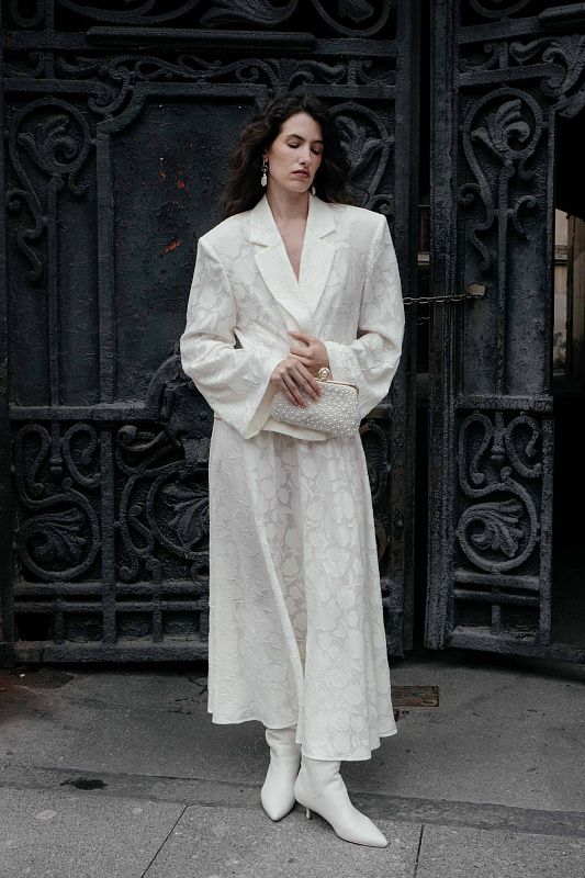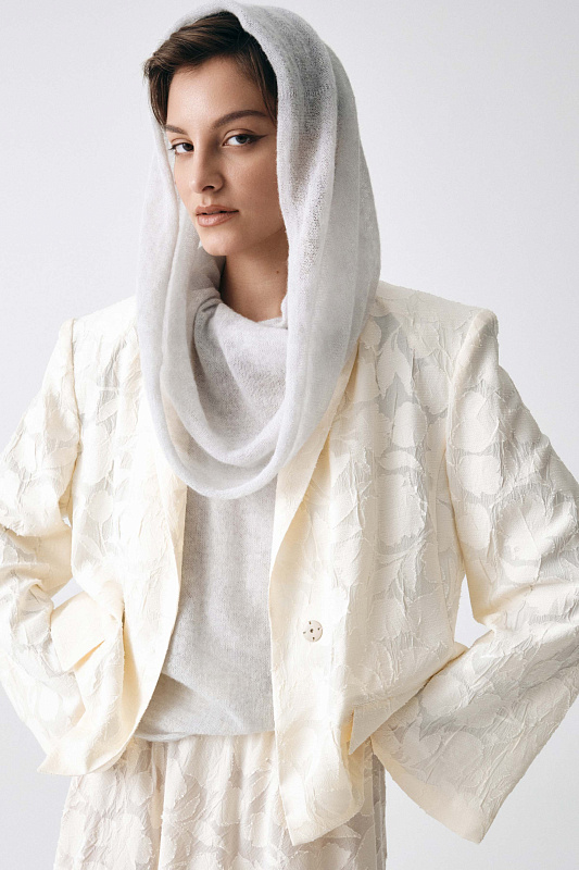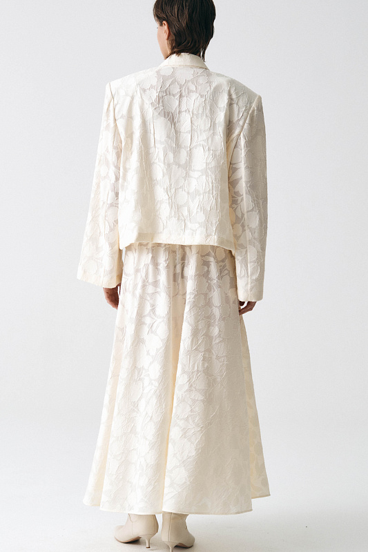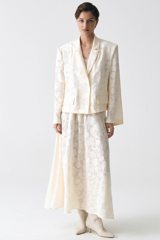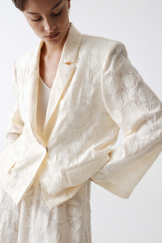 Классический однобортный укороченный жакет с потайной застежкой-кнопкой. Прямой рукав и прорезные неглубокие карманы с клапанами сохраняют классическую основу, контрастируя с укороченной длиной изделия. Такая длина оптически вытягивает силуэт, превращая классический элемент гардероба в современный. Увеличенная линия плеча подчеркивает безупречную геометрию силуэта, создавая идеальные пропорции. Плечи выглядят не «большими», а идеально прямыми и четкими. Отсутствие видимой застежки создает идеально линию и акцентирует внимание на качестве ткани. Настоящее произведение — это ткань, из которой выполнен жакет. На воздушном полупрозрачном полотне торжественно рассыпаны изысканные фактурные цветы.