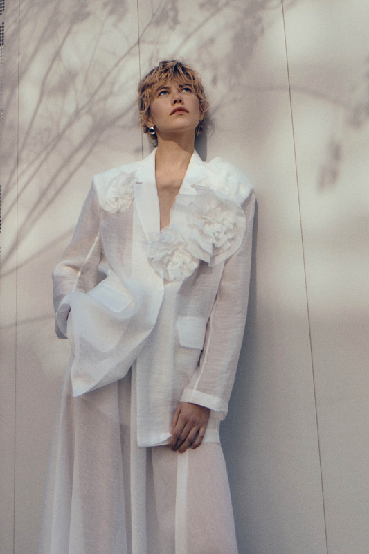 Жакет из прозрачной ткани — это воплощение женственности и элегантности. Он струится, словно невесомое облачение, подчёркивая красоту и изящество фигуры. Единственная застежка-кнопка немного структурирует силуэт. Подплечники добавляют стати, а клапаны карманов подчёркивают внимание к деталям. В комплекте с жакетом потрясающий цветок, который можно носить с любой одеждой, так как он крепится на очень прочный магнит. Дизайнерский подход к разработке модели позволит Вам создать уникальный образ.