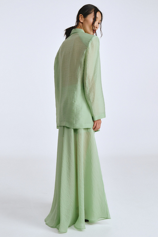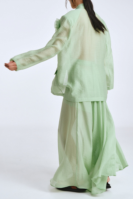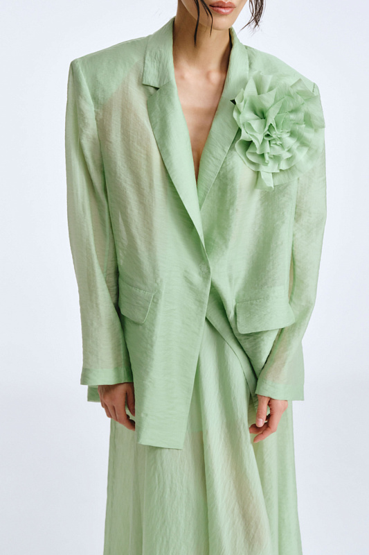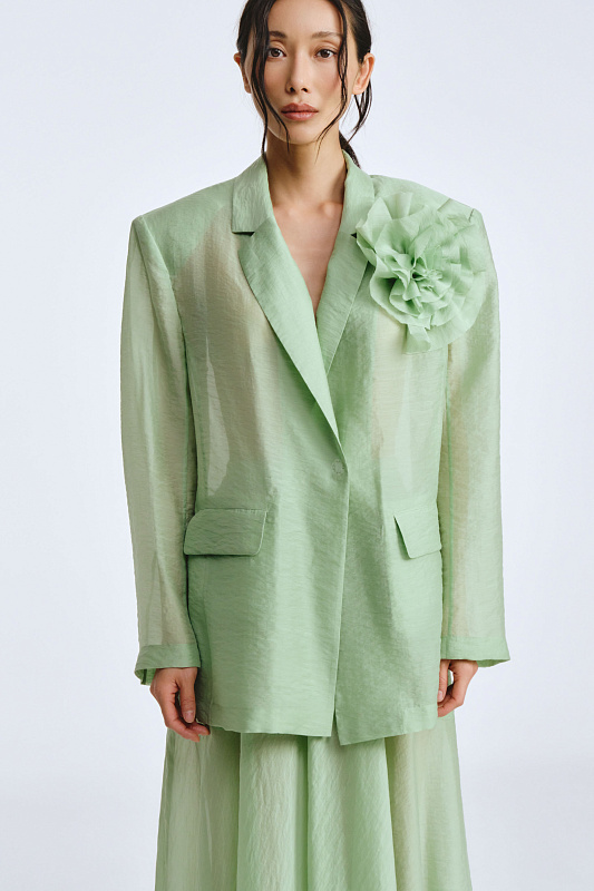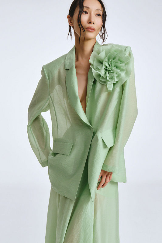 Жакет из прозрачной ткани — это воплощение женственности и элегантности. Он струится, словно невесомое облачение, подчёркивая красоту и изящество фигуры. Единственная застежка-кнопка немного структурирует силуэт. Подплечники добавляют стати, а клапаны карманов подчёркивают внимание к деталям. В комплекте с жакетом потрясающий цветок, который можно носить с любой одеждой, так как он крепится на очень прочный магнит. Дизайнерский подход к разработке модели позволит Вам создать уникальный образ.