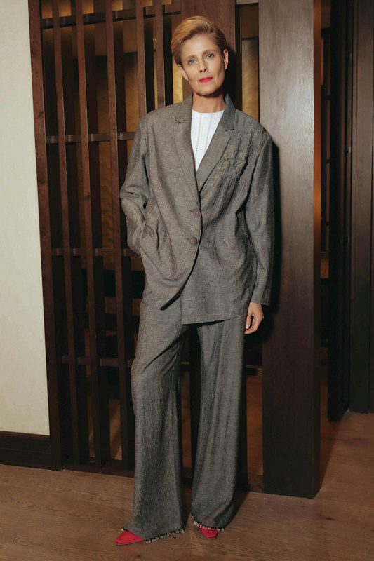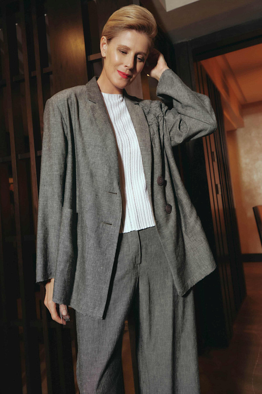 Мягкий вальяжный жакет прямого кроя из вискозы с добавлением льна без подкладки. Жакет застегивается на две большие пуговицы. Спущенная линия плеча. Два оригинальных накладных кармана расположены симметрично по одной полочке. Воротник пиджачного типа. Украшение жакета -дизайнерский декор в виде сложных архитектурных сборок. Края жакета не обработаны, что делает его уместным для создания креативных образов. Рекомендуем носить с брюками из одноименной капсулы, формируя стильную костюмную пару.
