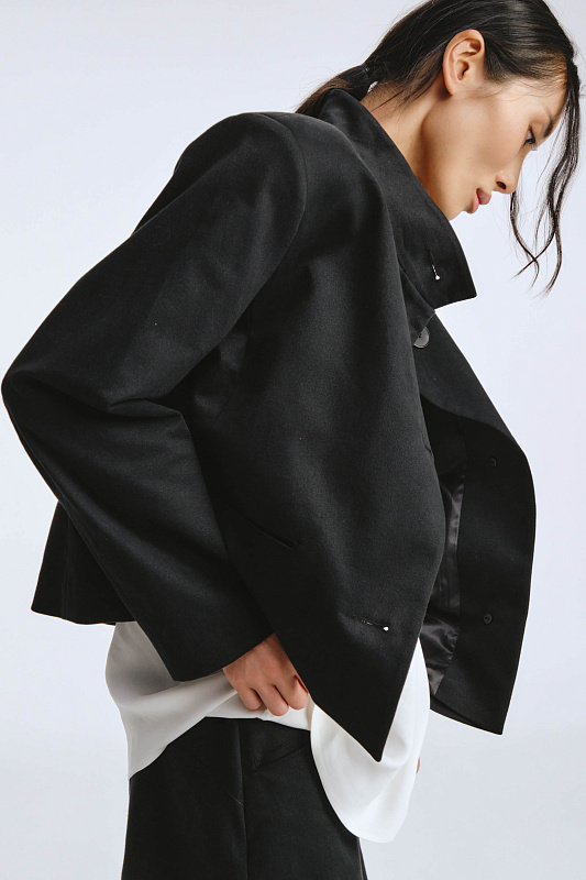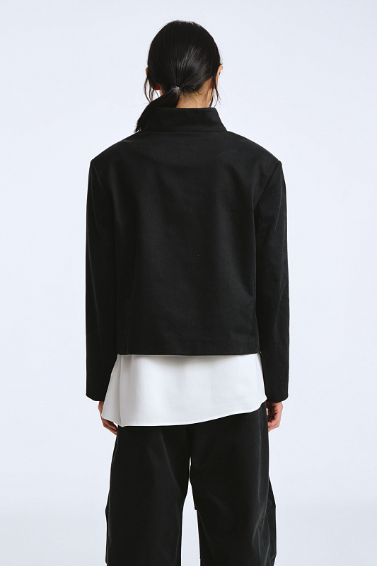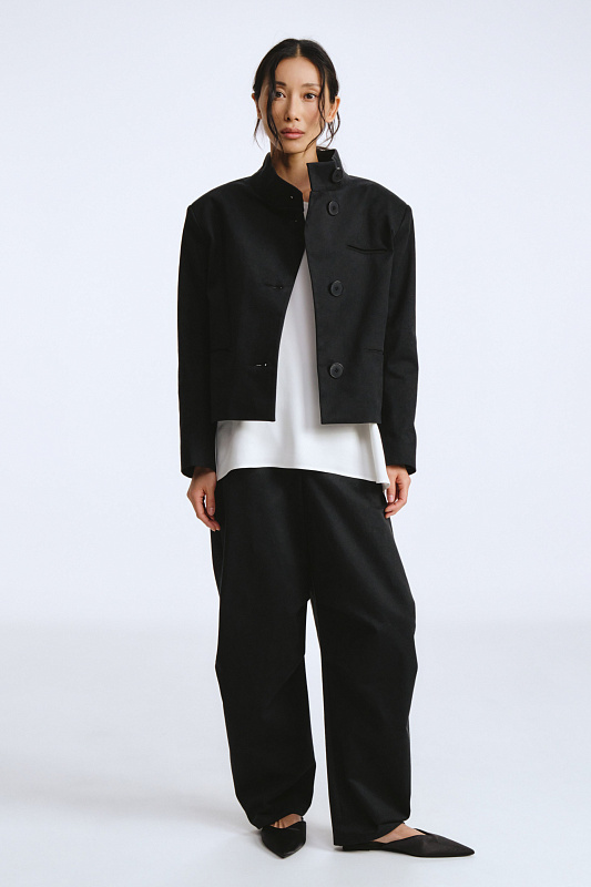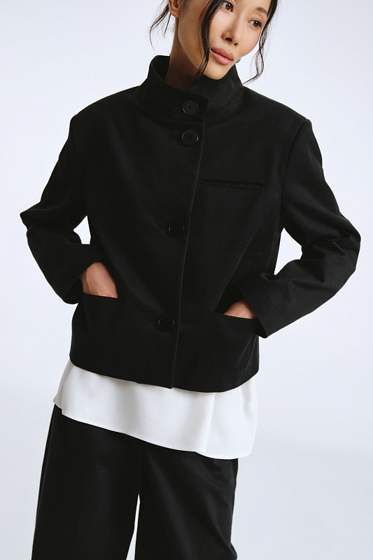 Жакет прямого укороченного силуэта с воротником-стойкой на крупной пуговице — это не только красивый, но и функциональный предмет гардероба, который выделяет ваш стиль. Увеличенная, с помощью подплечников, линия плеча подчеркивает стать, а укороченная длина — женственность. Два прорезных, боковых кармана добавляют удобства, а дизайнерский акцент — фальш-карман на груди — делает образ завершенным. Усложненный крой ворота указывает на исключительность жакета. Крупные пуговицы на лаконичном изделии создают утонченный образ. Добавление небольшого процента эластана в составе ткани и подкладка из саржи гарантируют правильную посадку и помогают сохранить форму. Жакет станет идеальной парой с брюками арт. 9025000.