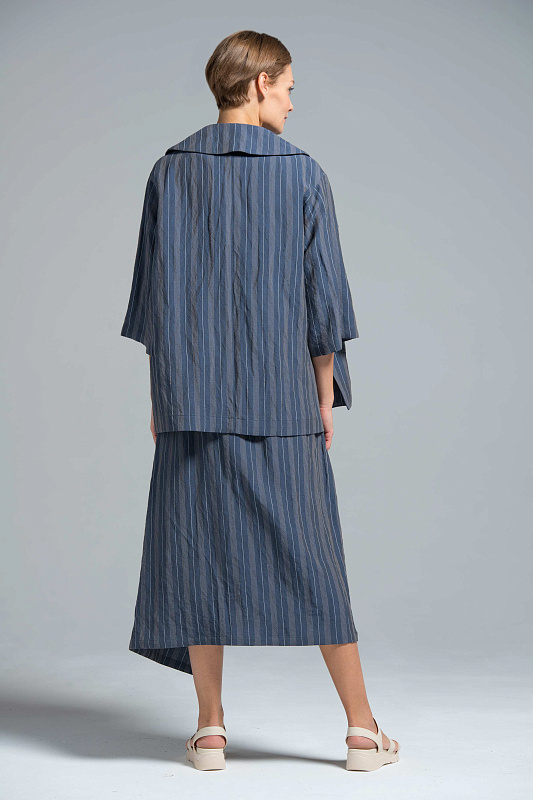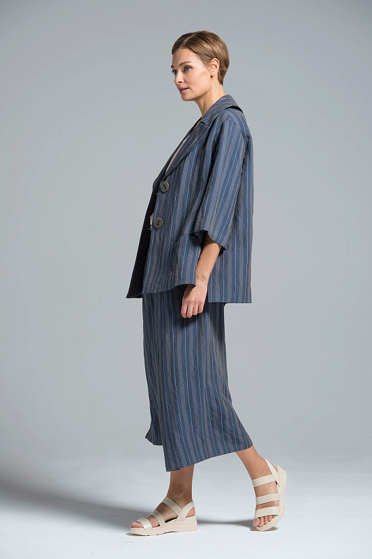 Легкий, летний жакет с отложным  воротником. Спущенный рукав длинной чуть ниже локтя. Застежка на оригинальных пуговицах, карманы накладные. Модель выполнена из экологичного итальянского льна в комбинации с нежной вискозой.