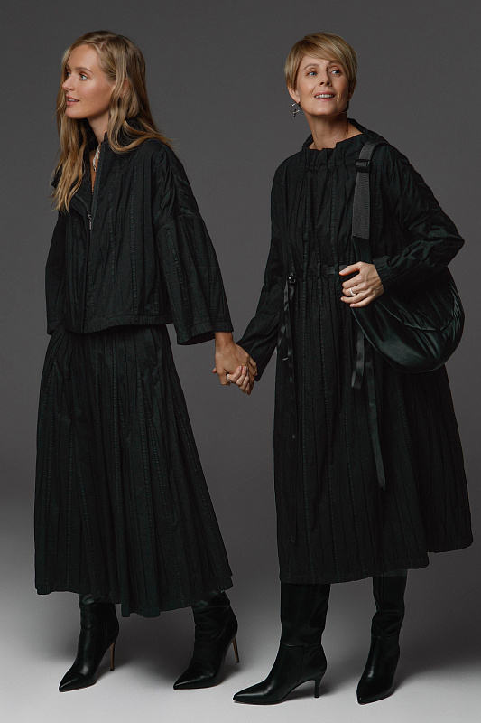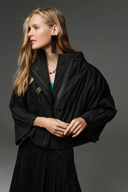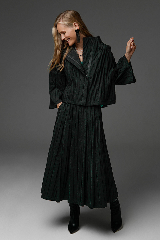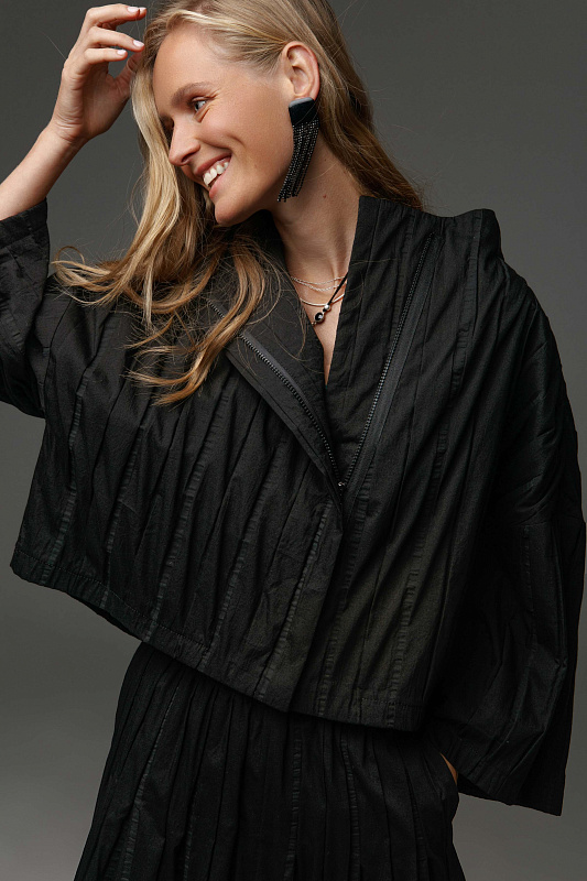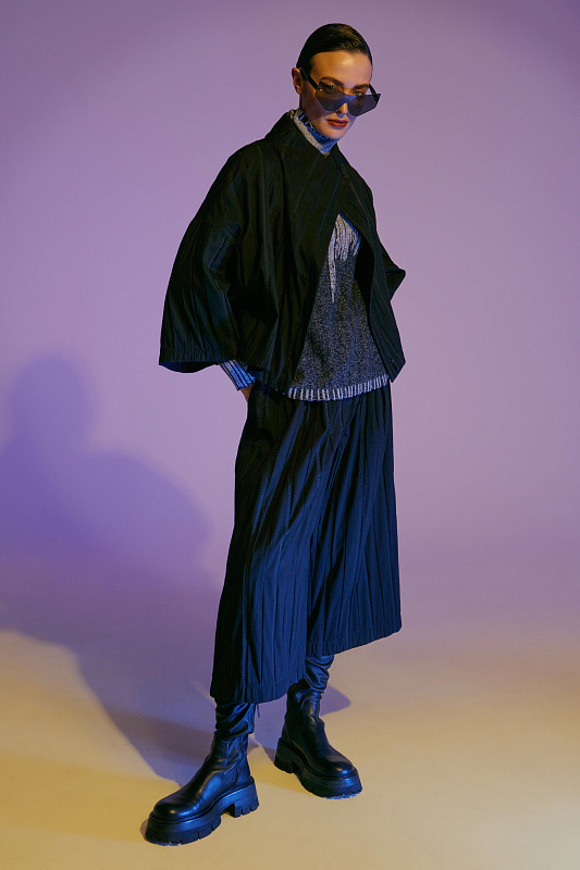 Креативный минималистичный жакет из оригинальной фактурной ткани со структурными полосами. Супатная застежка на тракторной молнии. Воротник - мягкая стойка. Силуэт - квадрат. Спущенная линия плеча, рукава - 7/8.
