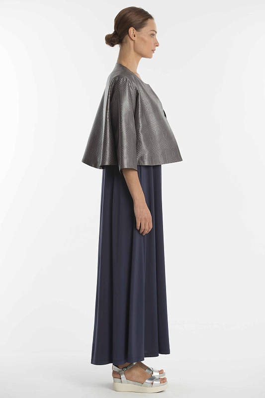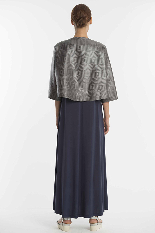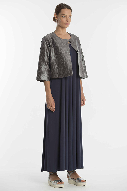 Изысканный жакет без воротника с летящей спинкой длиной до талии. Современный крой проймы. Ткань имитирует стёжку ромбики. Рукава 7/8, супатная застёжка на пуговицы.