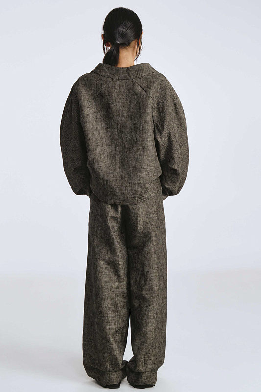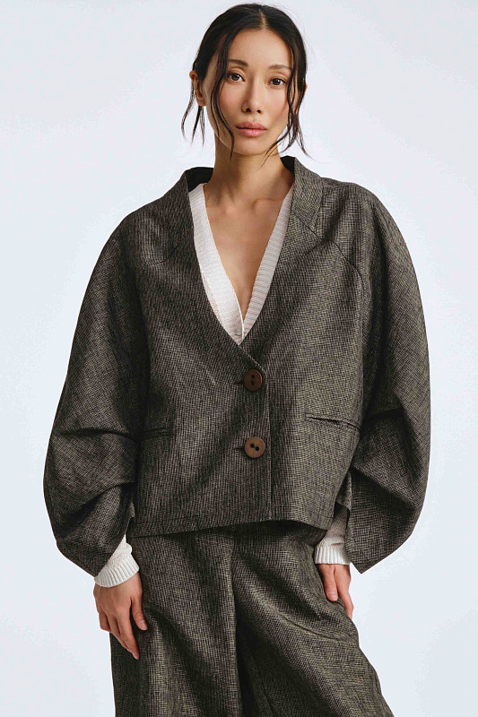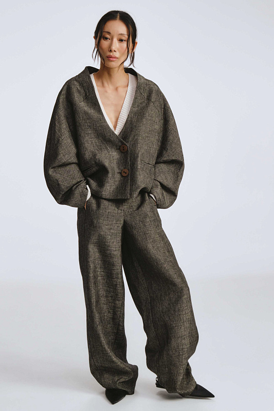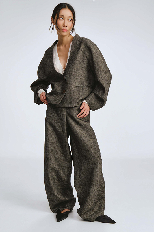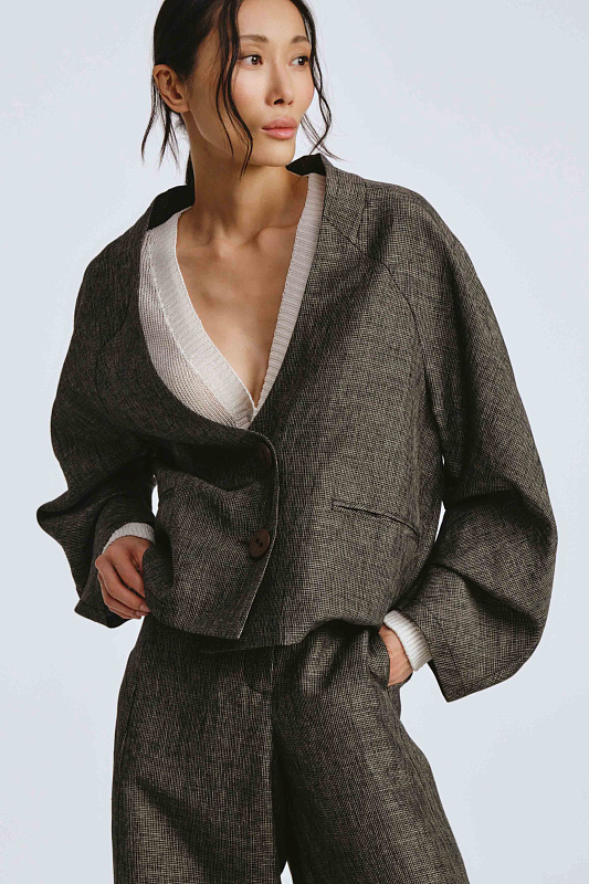 Укороченный жакет без лацканов — это настоящее искусство, созданное для тех, кто ценит свободу движений и элегантность. Его силуэт, напоминающий овал, выгодно подчеркивает достоинства фигуры, удлиняя линию ноги и акцентируя внимание на талии. Две пуговицы застежки не нарушают лаконичности образа. Особую привлекательность жакету придает рукав реглан, плавно перетекающий от горловины к запястью, создает мягкий силуэт, подчеркивает естественность движений. Защипы на внутренней стороне рукава — дизайнерский акцентный элемент, который четче прорисовывает силуэт и делает модель уникальной. Два небольших прорезных кармана — это элемент декора и удобство. Этот жакет идеально сочетается с брюками арт 8825279, создавая стильный и гармоничный ансамбль.