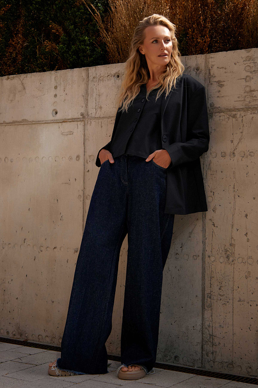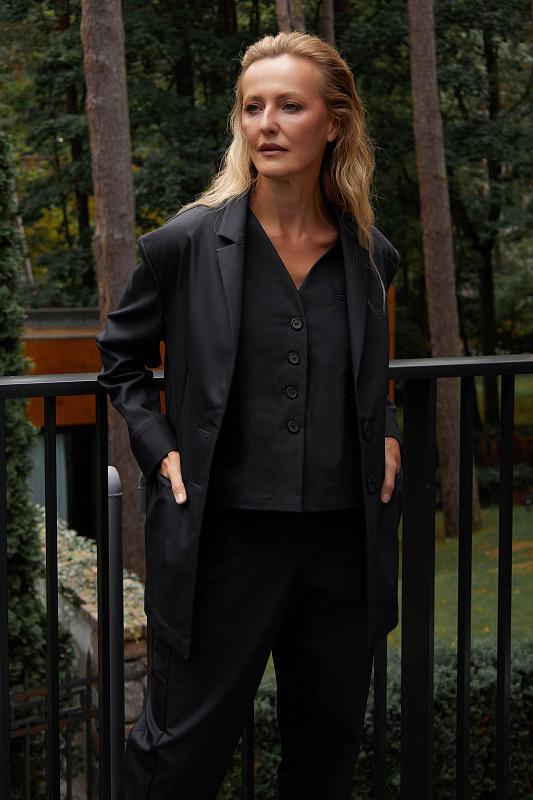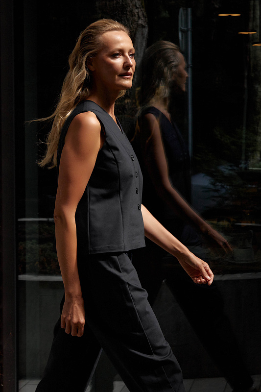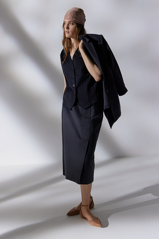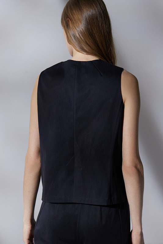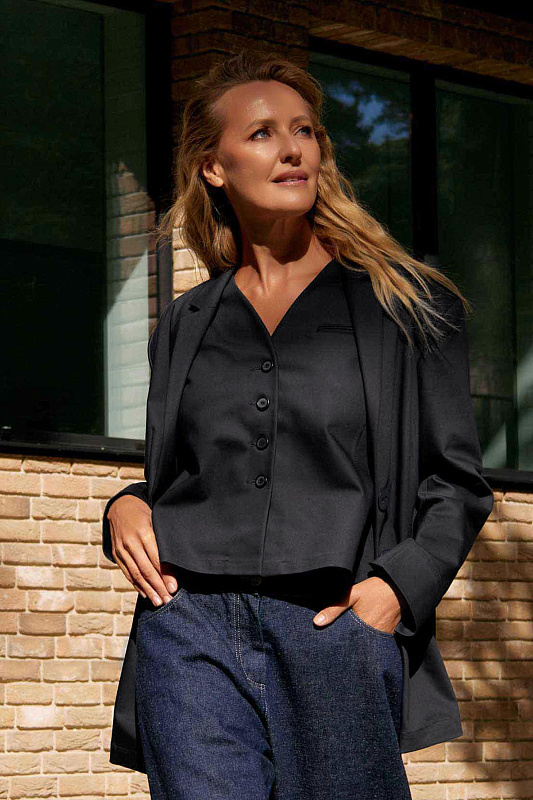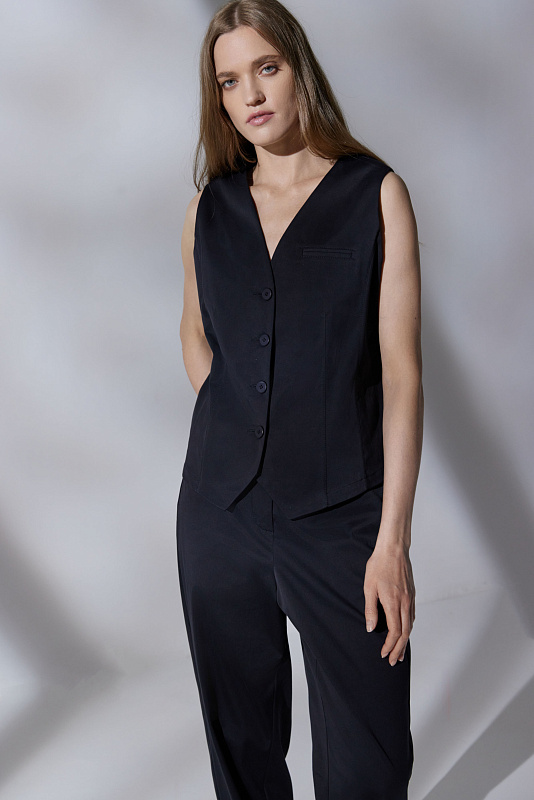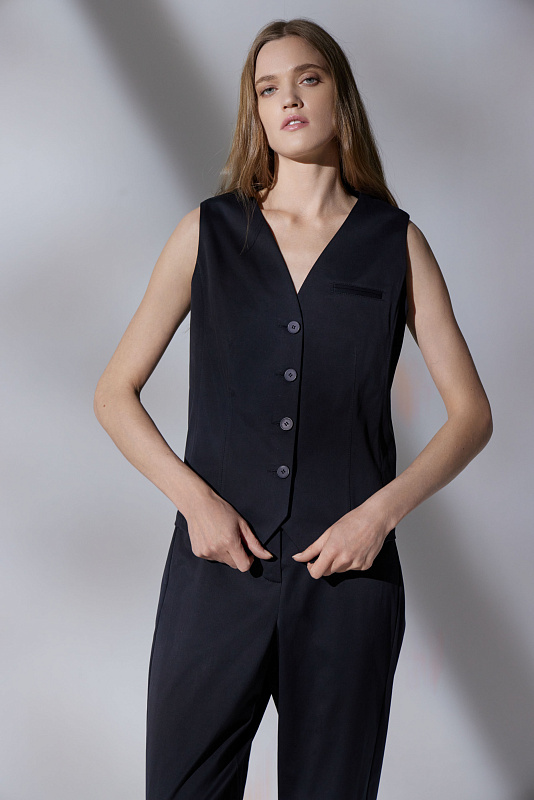 Эффектный жилет выполнен из хлопка с добавлением эластана. Высокая застежка на пуговички. По левой полочке фальш-карман. Шлица по спинке повышает градус креатива.