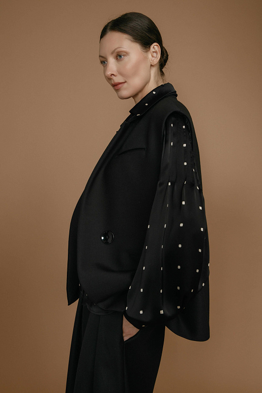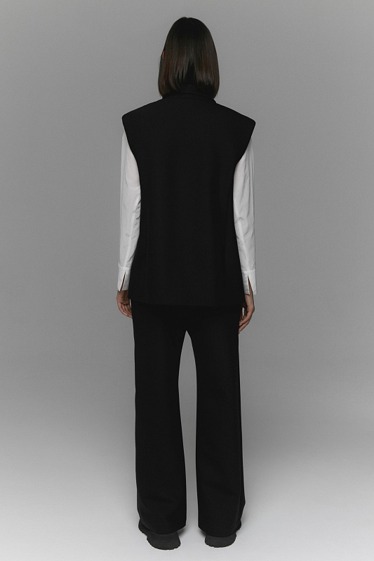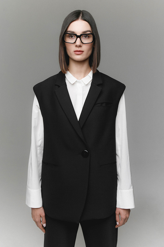 Жилет прямого силуэта с лацканами и имитацией нагрудного кармана. Удобные прорезные карманы. Застежка на большую пуговицу. Жилет на подкладке из нежной шелковистой вискозы. Удачно впишется как в деловой стиль, так и в базовый повседневный гардероб. Прекрасно сочетается с шортами из той же ткани, брюками, юбками и выигрышно смотрится надетым поверх платья.